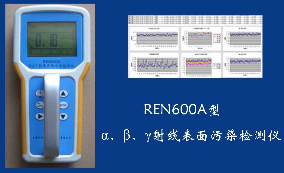 REN600A型α、β、γ射線表面污染檢測儀即可檢測α、β、γ射線,也能檢測到X射線,它采用高速嵌入式微處器作為數據處理單元,點陣式大屏幕LCD液晶顯示,讀數清晰、操作方便,具有400條超大容量數據存儲。儀器采用進口的大面積MICA蓋革探測器,具有較高探測效率,可進行α、β輻射表面污染檢測和X、γ輻射劑量率的監(jiān)測。此外通過配套的RenriCont表面污染管理軟件可將存儲的數據讀出后分析。可廣泛用在制藥廠、實驗室、發(fā)電廠、進出口商檢、采石場、環(huán)境實驗室、環(huán)境污染調查、核安全應急、緊急狀況營救站、金屬處理廠、地下油田、供油管道裝備、醫院核醫學科、同位素實驗室、環(huán)境保護和警察局等部門。REN600A型α、β、γ射線表面